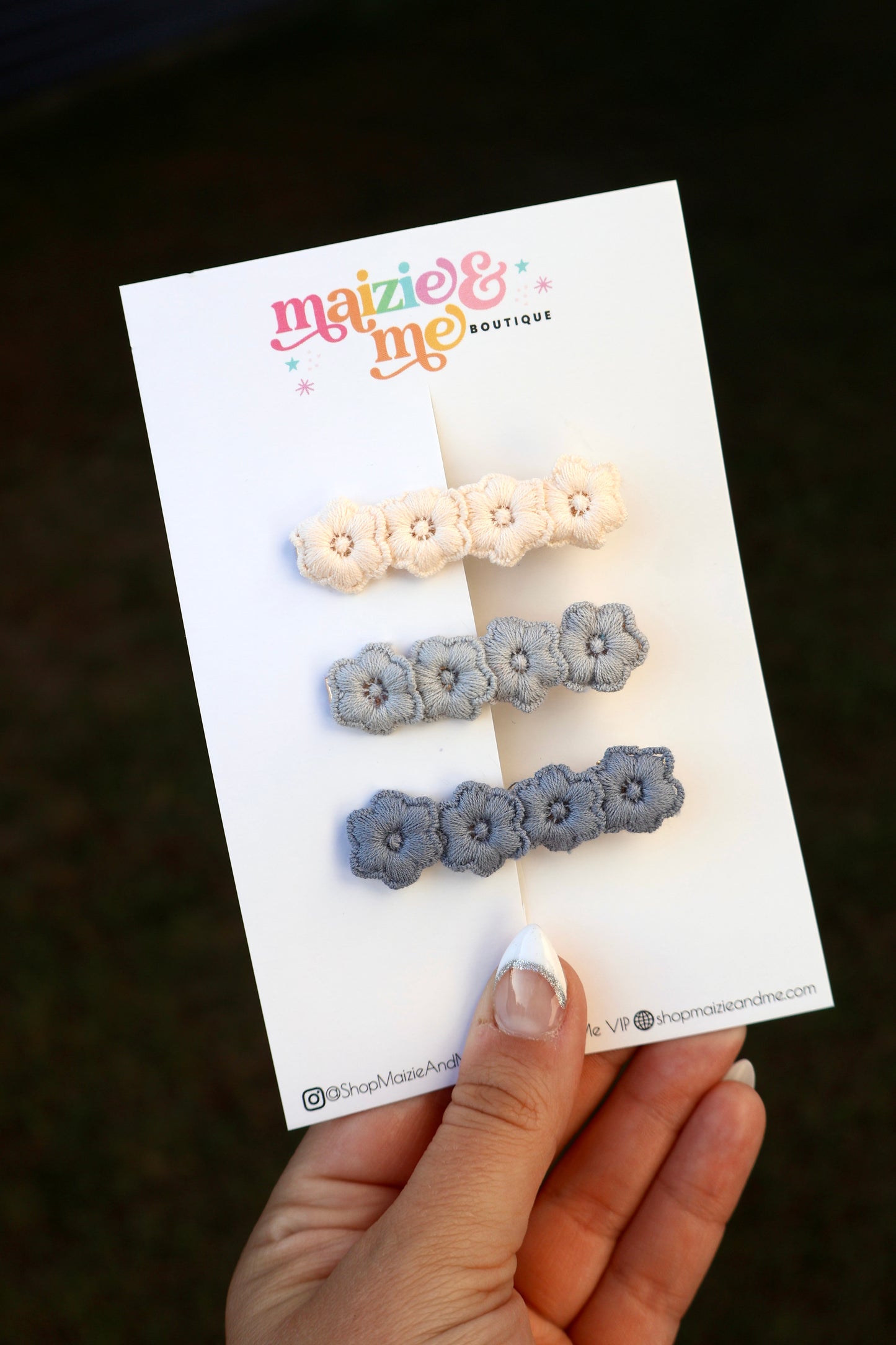 These bar clips with embroidered detailing are great for sweet and simple styling, or for sweeping baby hairs to the side.